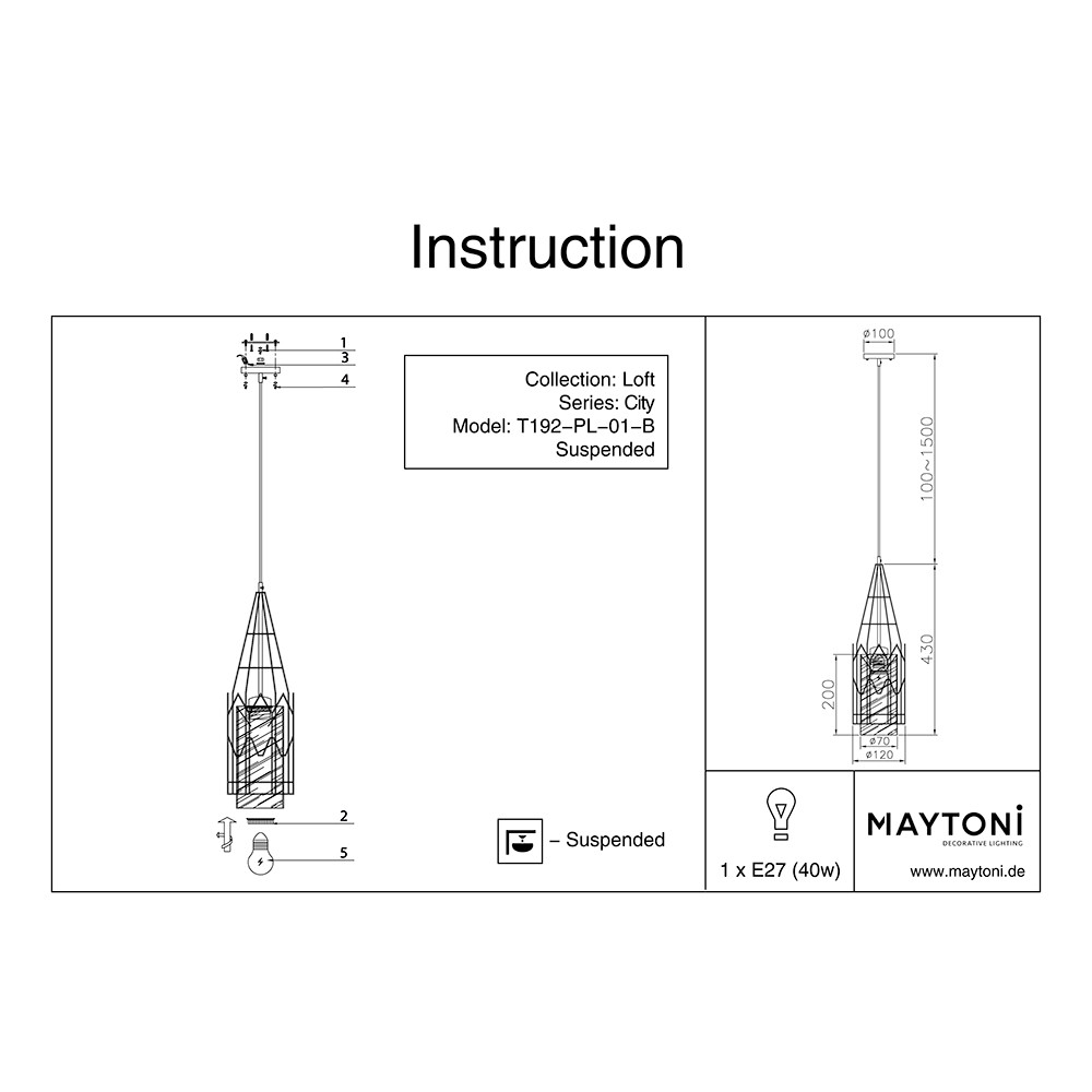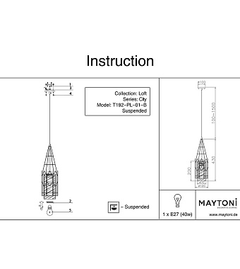 Светильник подвесной Maytoni Loft T192-PL-01-B 40Вт E27