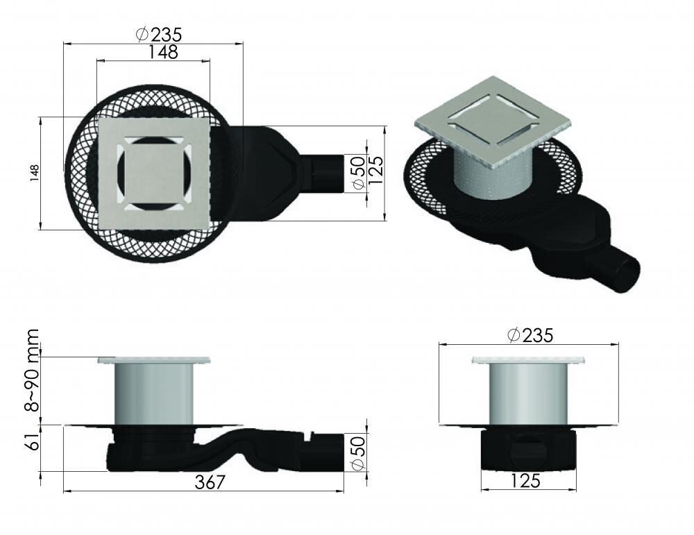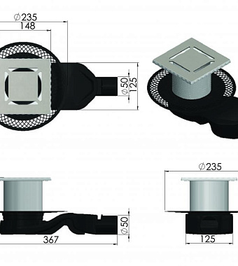Душевой трап BERGES 090159 150х150 36,7х23,5см горизонтальный сток