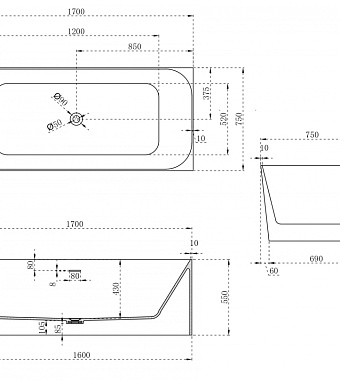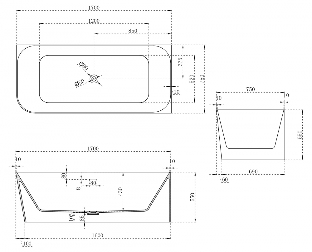 Ванна каменная Abber Stein AS9621-1.7 R 170х75см пристенная - купить в интернет-магазине Орегон с доставкой в регионы Крыма.